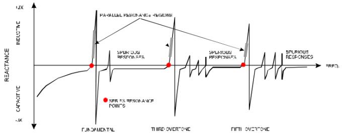 所有晶體都有許多諧振響應(yīng)(見圖5)。 第一個(gè)主要回應(yīng)是“基本面”。 在它的右邊,是下一個(gè)主要響應(yīng),即第三個(gè)泛音,然后是第五個(gè)泛音,依此類推。 只有奇異的泛音。 泛音響應(yīng)不是基波的諧波。 根據(jù)定義,諧波是較低頻率的精確倍數(shù)。 例如,第三泛音通常位于基頻的2.8至3.2倍之間。 所以晶體有