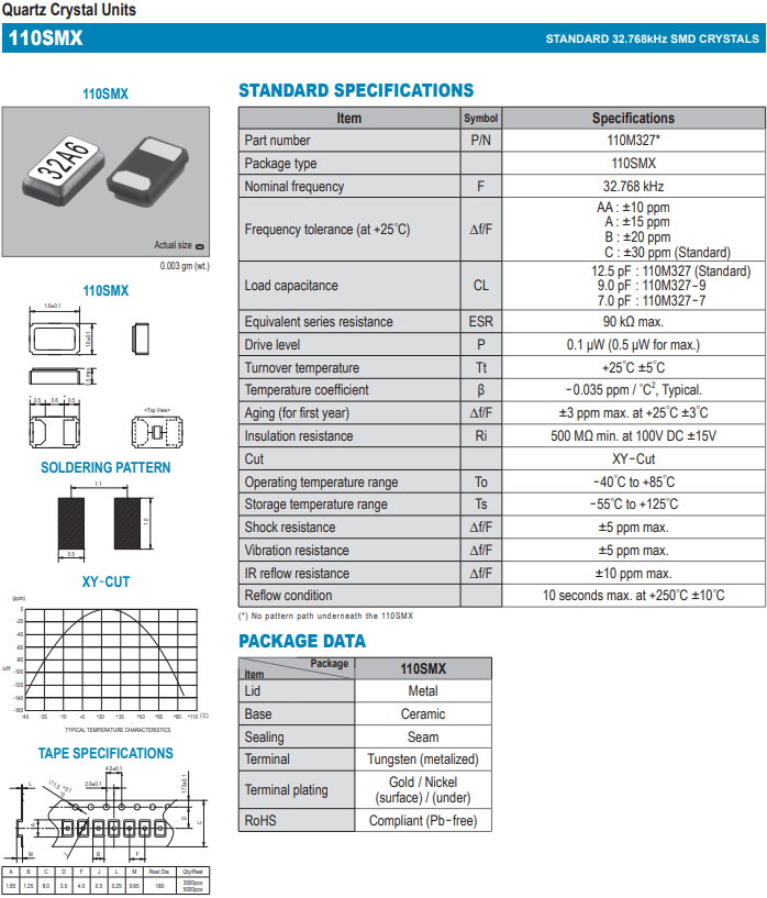 SMI晶體,SMD晶振,110SMX音叉表晶.該類產品符合RoHS規定,滿足無鉛焊盤的高溫回流溫度曲線要求,金屬外殼的封裝使得產品在封裝時能發揮比陶瓷諧振器外殼更好的耐沖擊性.