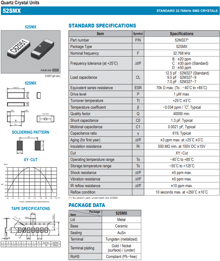 SMI晶體,SMI Crystal,52SMX無源晶振.小型,薄型,質地輕的表面貼片音叉型晶體諧振器,手機晶體,產品體積小,特別適用于各種小巧的便攜式消費電子數碼產品,在移動通信領域廣泛的應用,晶振產品本身可發揮優良的電氣特性,滿足無鉛焊盤的高溫回流溫度曲線要求.