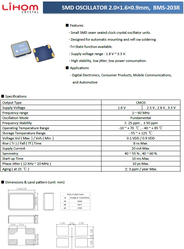 Lihom Crystal,貼片晶振,BMS-203R振蕩器.小型表面貼片型貼片晶振,較適合使用在汽車電子領域中,也是特別要求高可靠性的引擎控制用CPU的時鐘部分.低頻晶振可從7.98MHz起對應,小型,薄型具備強防焊裂性,石英晶振在惡劣嚴酷的環境條件下也能發揮穩定的起振特性.