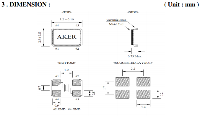 封裝 | 金屬面貼片 | 尺寸 | 3.2*2.5*0.75mm |