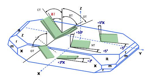 依據(jù)不同的應(yīng)用領(lǐng)域及工作溫度需求, 因應(yīng)了許多不同的石英切割角度種類. 例如AT-, BT-, CT-, DT-, NT, GT…..等不同的切割板片. 不同的切割方向的板片具有不同的彈性常數(shù)張量(elastic constant tensor), 不同的壓電常數(shù)張量(piezoelectric constant tensor)及不同的介電常數(shù)張量(dielectric constant tensor). 這些張量在石英組件的設(shè)計及應(yīng)用上展現(xiàn)了不同的振蕩及溫度特性. (圖三)表現(xiàn)了在Z-plat石英結(jié)構(gòu)上,幾種不同方向的石英板片切割方式.