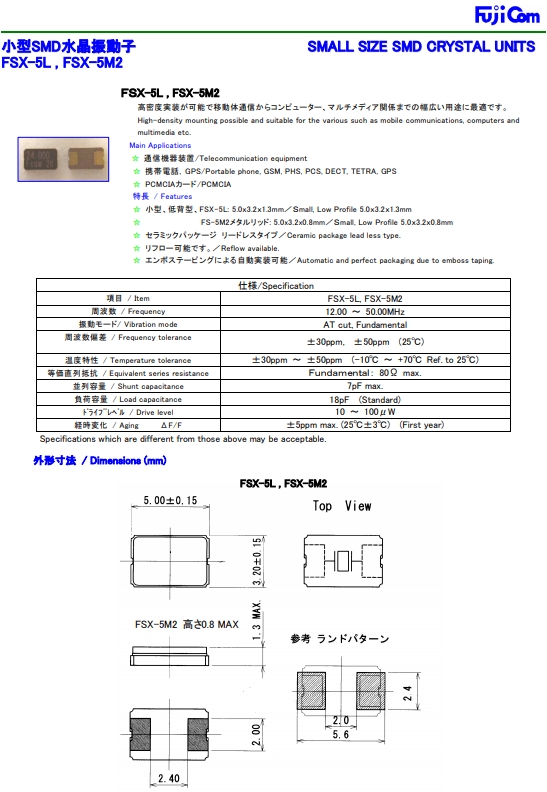 富士晶體,石英晶振,FSX-5L石英諧振器.貼片石英晶體,體積小,焊接可采用自動貼片系統,產品本身小型,表面貼片晶振,富士石英晶體主要應用領域:無線通訊,智能手機,平板筆記本WLAN,藍牙,數碼相機,DSL和各式IT產品的晶振應用,三態功能,PC和LCDM等數碼領域,符合RoHS/無鉛.