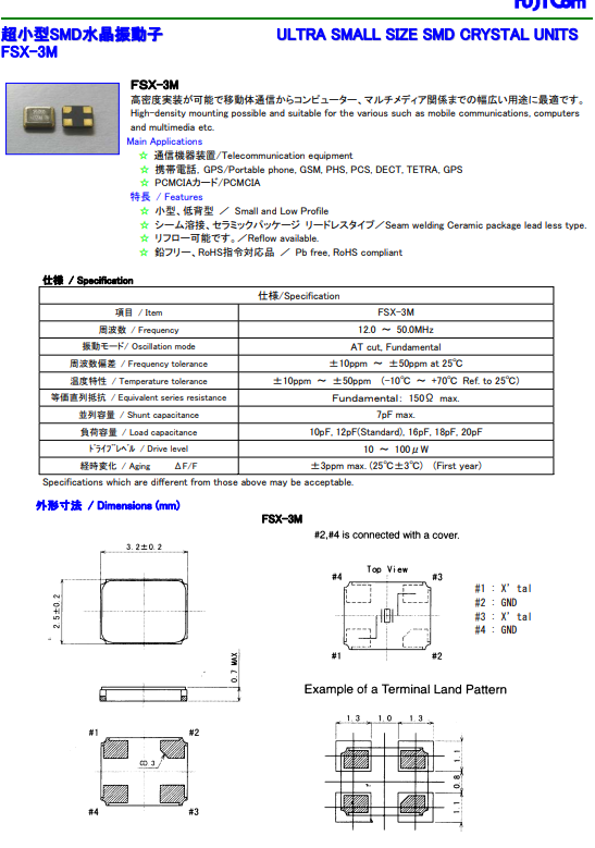 富士晶振,Quartz crystal,FSX-3M石英晶體諧振器.小型表面貼片型貼片晶振,較適合使用在汽車電子領(lǐng)域中,也是特別要求高可靠性的引擎控制用CPU的時(shí)鐘部分.低頻晶振可從12MHz起對(duì)應(yīng),小型,薄型具備強(qiáng)防焊裂性,石英晶體在惡劣嚴(yán)酷的環(huán)境條件下也能發(fā)揮穩(wěn)定的起振特性,產(chǎn)品本身具有耐熱,耐振,耐撞擊等優(yōu)良的耐環(huán)境特性,滿足無(wú)鉛焊盤以及高溫回流溫度曲線要求,符合AEC-Q200認(rèn)證.