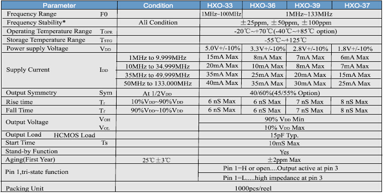 鴻星普通有源晶振HXO-3,HXO-Q3石英晶振,7050mm振蕩器,HXO-3系列是一個超微型包時鐘振蕩器尺寸為7.0 * 5.0 * 1.5mm,工作電壓1.8V~5.0V可供選擇.三態啟用/禁用TTL / HCMOS兼容的磁帶和卷軸紅外回流,主要用于便攜式電腦和電信設備和設備.