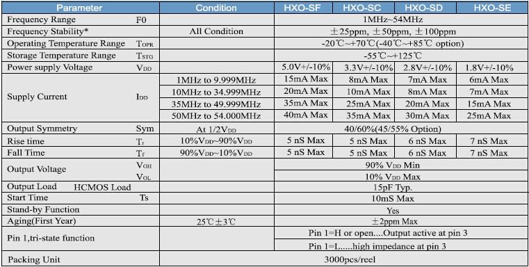 有源晶振HXO-S3225,HXO-N2520,HXO-M2016振蕩器,HXO-QS3225,HXO-QN2050鴻星晶振,非常緊湊輕薄(3.2 * 2.5 * 1.2mm MAX)頻率范圍1MHZ~54MHZ,工作電壓1.8V~5.0V.HXO-S系列超迷你包時鐘振蕩器尺寸為3.2 * 2.5 * 1.2毫米,主要用于便攜式電腦和電信設備和設備.