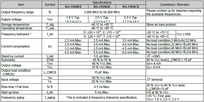 SPXO晶體振蕩器,SG-150SEE有源晶振,愛普生2016mm晶振,頻率范圍3.0MHz~54.0MHz,電源電壓1.8V~3.3V,功能使能(OE),外部尺寸規(guī)格2.1×1.7×0.75mm,滿足無鉛焊接的高溫回流溫度曲線要求,帶有AFC(頻率控制)功能,Enable/Disable功能,產(chǎn)品本身可根據(jù)使用需要進行選擇.