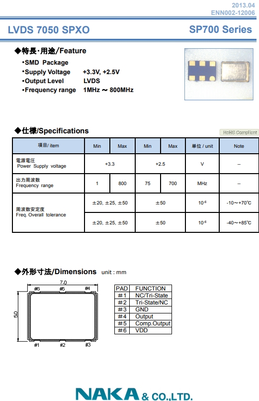 NAKA晶體,SPXO振蕩器,SP700晶體振蕩器.小型貼片有源晶振,體積的變小也使產品帶來了更高的穩定性能,接縫密封日本NAKA晶振,精度高,覆蓋頻率范圍寬的特點,貼片高速自動安裝和高溫回流焊設計,Optionable待機輸出三態輸出功能,電源電壓范圍:1.8V~5V,高穩定性,低抖動,低功耗.