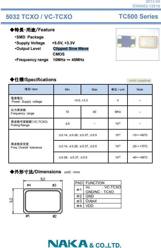 NAKA晶體,NAKA Crystal,TC500有源晶振.溫補(bǔ)晶振(TCXO)產(chǎn)品本身具有溫度補(bǔ)償作用,高低溫度穩(wěn)定性:頻率精度高0.5PPM~2.0PPM,常用頻率:26M,33.6M,38.4M,40M.因產(chǎn)品性能穩(wěn)定,精度高等優(yōu)勢(shì),被廣泛應(yīng)用到一些比較品質(zhì)的數(shù)碼通訊產(chǎn)品領(lǐng)域,導(dǎo)航定位系統(tǒng),智能手機(jī),WiMAX和無(wú)線通信等產(chǎn)品,符合RoHS/無(wú)鉛.