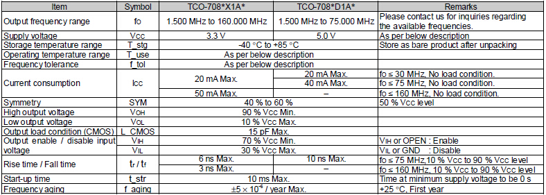 TCO-7085X1A,X1A1,X1A2,DA1,D1A1,D1A2振蕩器,愛普生攝像頭晶振,頻率范圍1.5MHz~160MHz,電源電壓3.3V~5.5V,功能使能(OE),外部尺寸規格7.0×5.0×1.6mm,編帶包裝方式,可對應自動高速貼片機自動焊接,及IR回流焊接(無鉛對應),為無鉛產品,超小型,質地輕.產品被廣泛應用到集成電路,程控交換系統,無線發射基站.