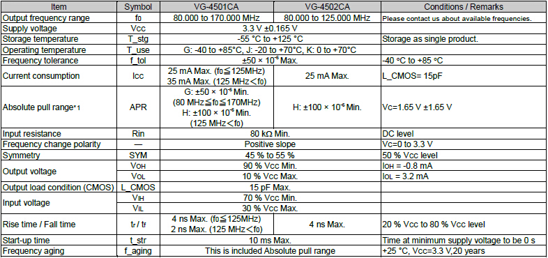 愛普生有源晶振,VG-4501,4502CA振蕩器,“VG-4501CA 61.4400M-GGCT3”高精度晶振,外部尺寸規格7.0×5.0×1.6mm,輸出LV-PECL,頻率范圍80MHz~170MHz,電源電壓3.3V,絕對頻率控制范圍50×10-6, 100×10-6,功能使能(OE)Active High or Low.VCXO壓控晶體應用:調制解調器,ADSL網絡控制器,無線基站,程控交換設備智能手機,筆記本晶振等符合RoHS/無鉛.
