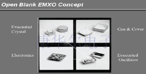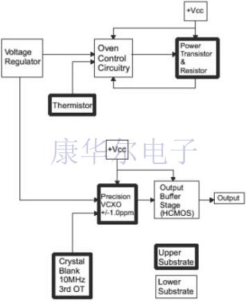 使用厚膜絲網(wǎng)印刷技術(shù)制造基板,每個沉積層都經(jīng)過三個不同的處理階段-印刷,干燥和燒制.晶體夾以高導(dǎo)熱率附著在基板上的金導(dǎo)體上.使用導(dǎo)電粘合劑將所有有源和無源組件安裝在基板上,然后將其移動到對流烤箱中進(jìn)行固化.在固化過程之后,將雜種清洗,以去除有機和非有機污染物.導(dǎo)線在互連電路上作為互連線接合.然后用粘合劑將混合電路連接到冷焊包裝上.最后,將空白晶體安裝到夾子上,并通過蒸發(fā)過程將其調(diào)諧到所需的標(biāo)稱頻率,典型精度為1ppm.然后將單元冷焊密封.烤箱本身通過直接施加到導(dǎo)熱基材上的熱傳導(dǎo)進(jìn)行加熱.在下面的圖3中,顯示了此“空白”EMXO概念,并與傳統(tǒng)的OCXO結(jié)構(gòu)進(jìn)行了比較.