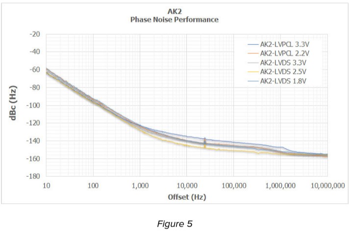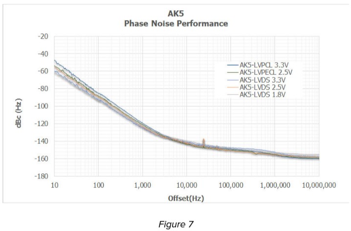 圖7總結了具有LVPECL和LVDS輸出格式的AK5[5.0 x 3.2 x 1.3 mm]設備在所有可用Vdd電平下的典型相位噪聲性能。