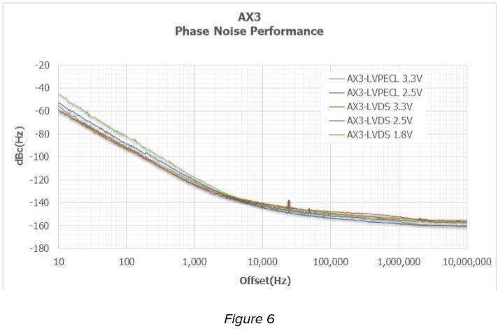 圖6總結了具有LVPECL和LVDS輸出格式的AX3[3.2 x 2.5 x 1.0 mm]設備在所有可用Vdd電平下的典型相位噪聲性能。