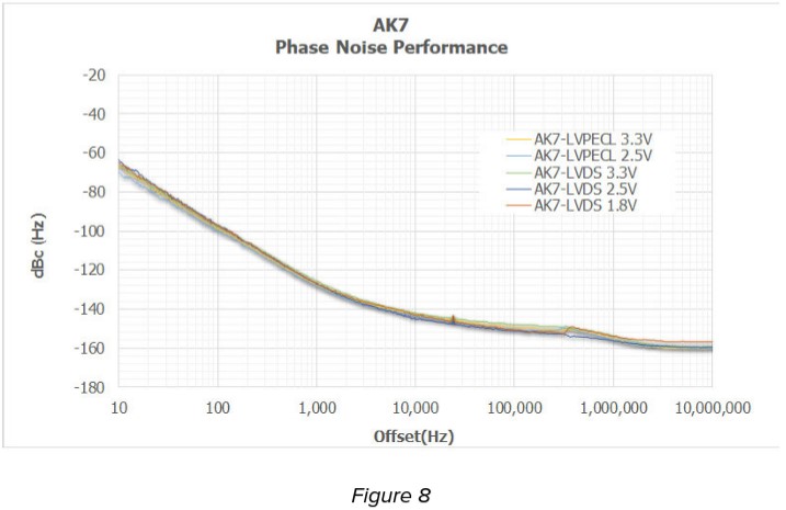 圖8總結了具有LVPECL和LVDS輸出格式的AK7[5.0 x 7.0 x 1.8 mm]設備在所有可用Vdd電平下的典型相位噪聲性能。
