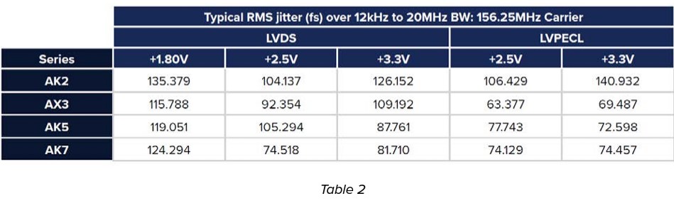 AK5和AK7解決方案最適合在+3.3V偏置時,在156.25MHz載波上需要最大100fs的保證RMS抖動的系統。這些解決方案分別有5.0x3.2mm和5.0x7.0mm封裝。如果設計具有不動產挑戰,那么AX3[3.2x2.5x1.0mm]或AK2[2.5x2.0x1.0mm]都是理想的選擇,分別提供150fs和200fs的最大RMS抖動性能。AK2、AX3、AK5和AK7設備都有LVDS、LVPECL或HCSL的標準工業輸出格式。