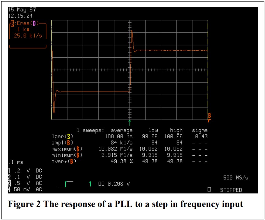圖2顯示了PLL動態響應的一個典型測量實例。該PLL用于頻率合成器,并顯示了對10 MHz參考輸入中的80 kHz步長的響應。該電路的捕獲范圍約為+/-中心頻率的5%