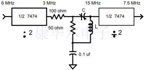 該合成器使用單個(gè)7474觸發(fā)器將6MHz輸入轉(zhuǎn)換為7.5MHz(倍數(shù)為1.25).來(lái)自石英振蕩器的6MHz方波被觸發(fā)器之一分頻,并施加到類似于圖2的網(wǎng)絡(luò)上.1.將3MHz(15MHz)的五次諧波除以第二觸發(fā)器產(chǎn)生7.5MHz.