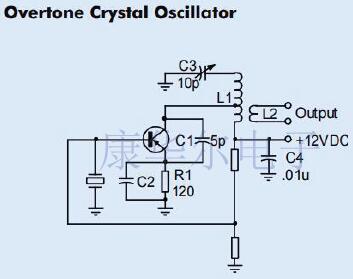 該電路中的晶體直接連接在晶體管的基極和地之間.由于晶體管的內部電容,電容器C1用于改善反饋.該電容器應盡可能靠近晶體管安裝.晶體管集電極中的LC儲能電路被調諧到晶體的泛音頻率.發射極電阻電容器在工作頻率下必須具有大約90Ω的容抗.電感器L1上的抽頭用于匹配晶體管集電極的阻抗.通常,此抽頭的位置距離線圈冷端約三分之一.陷阱的放置是在穩定性和最大功率輸出之間的權衡.輸出信號取自鏈接耦合線圈L2,并通過變壓器作用進行工作.