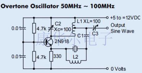 在該電路中,晶體被AT切割并以泛音模式工作.L1和C2調諧到工作頻率,而L2和晶體的并聯電容應在振蕩器輸出頻率諧振.(例如,在90MHz時,L2約為0.5µH.這對于調出晶體C0是必需的.)調節C3以匹配振蕩器輸出.